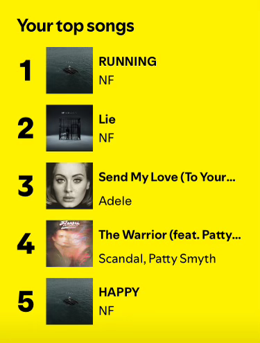 There’s no doubt I listened to a lot of NF this year. What can I say? His music is creative, honest, haunting, original - and just all-around great. I can’t think of another artist who so openly wears their heart on their sleeve in their music. That’s why I love it and why I keep listening. It’s no surprise that 3 of my top 5 songs were by NF, with “Running” taking the crown as my most-played track.